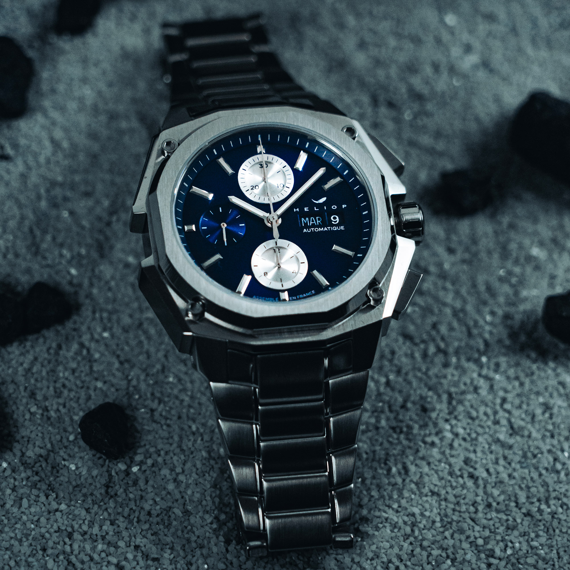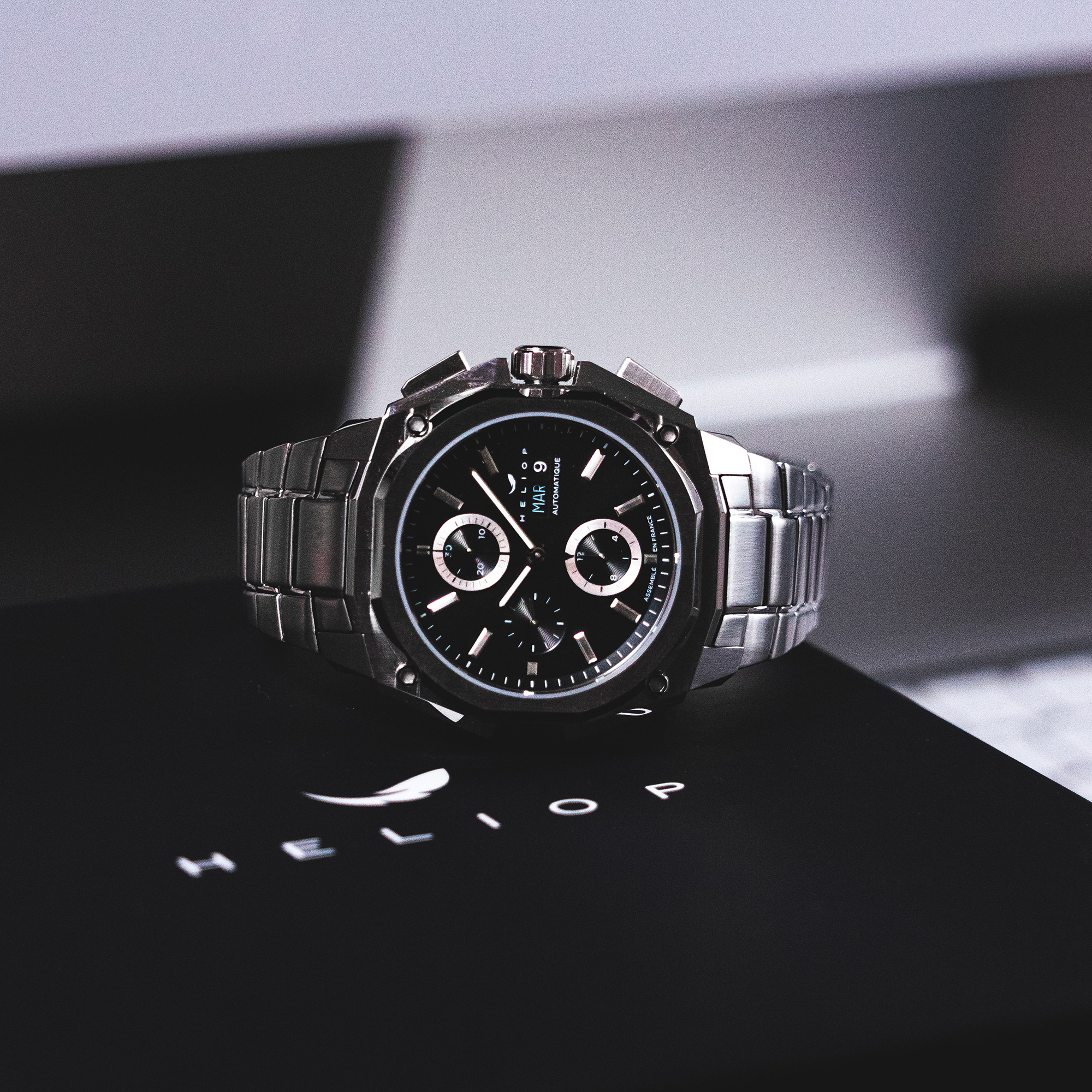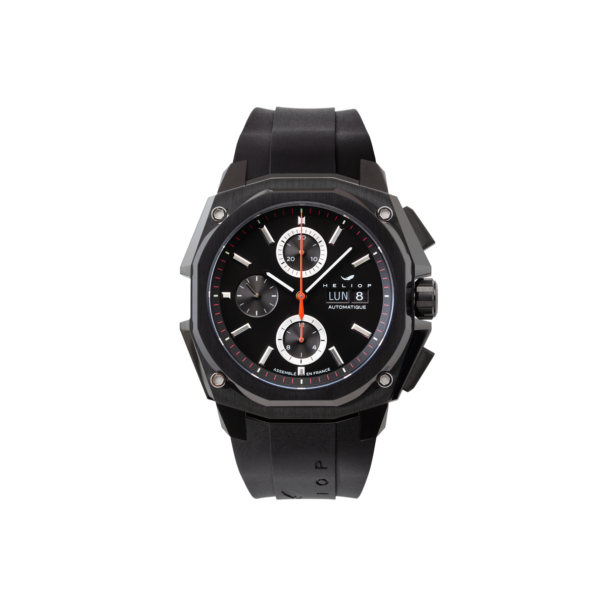 Heliop assume un design moderne et nerveux. Pour sa première collection, le parti pris est d’offrir une pièce qui revendique une certaine puissance, une signature esthétique qui correspond à son état d’esprit et à celui de ses collectionneurs actifs, sportifs et urbains.