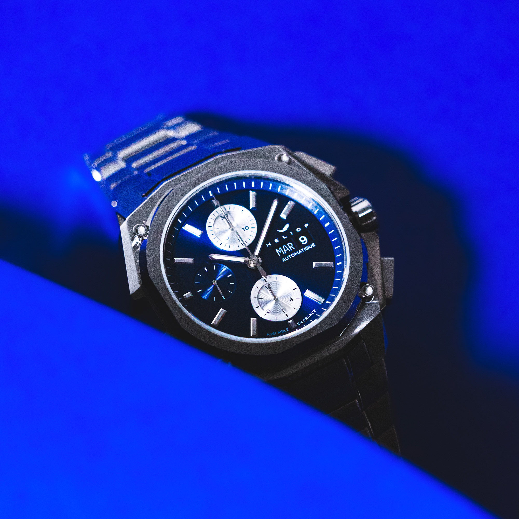 Heliop est née dans le Sud-Ouest, terre de sports, de nature, de rugby, de grand air et d’océan. Sa série inaugurale reflète cet état d’esprit, cette communion de nature et de performance, pour laquelle le chronographe s’est naturellement imposé comme la complication idéale.